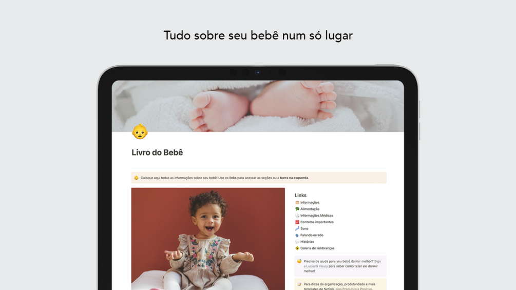 Template do Notion que será o seu Livro do Bebê virtual. Sempre com você, até no seu bolso!
